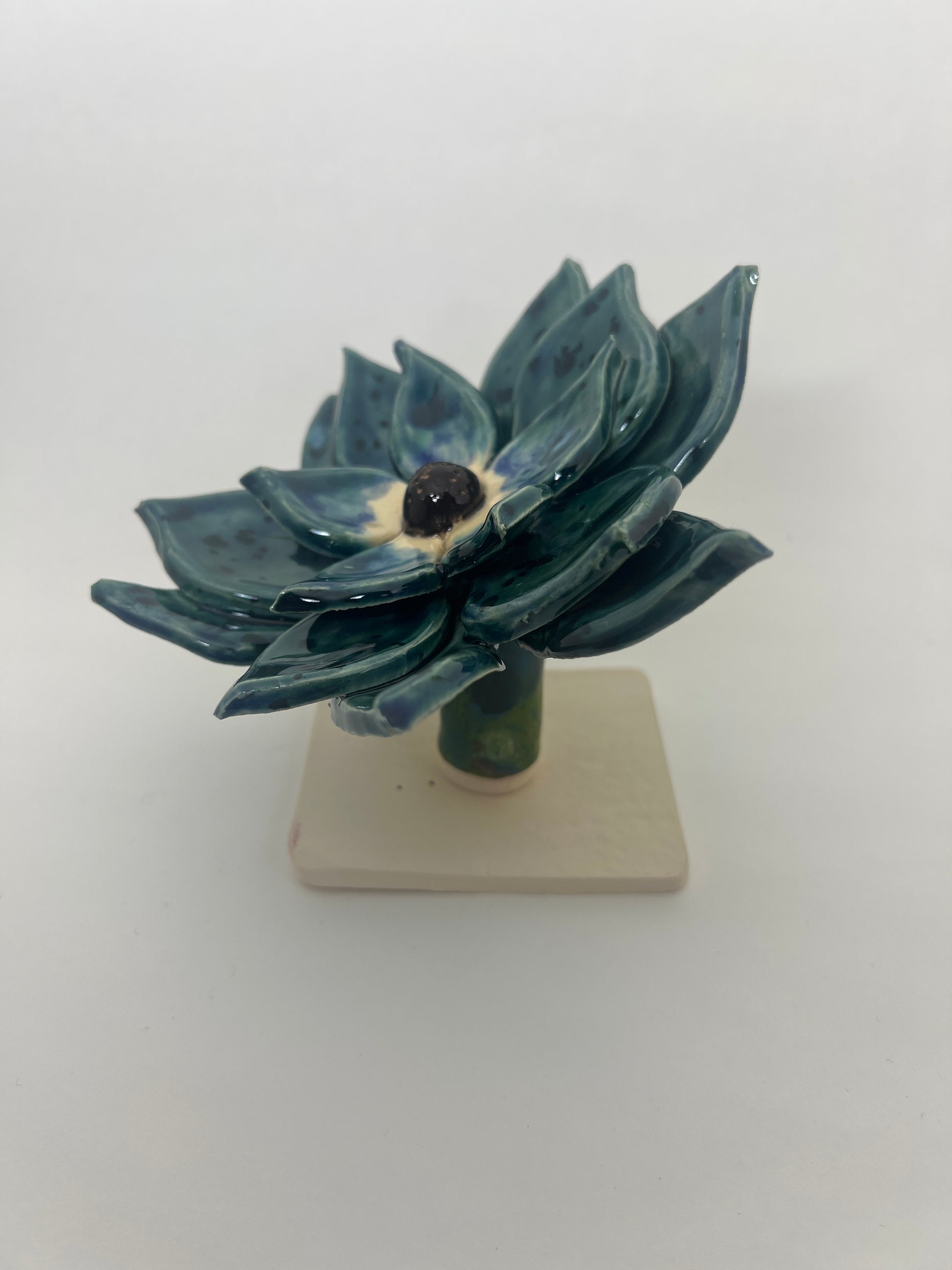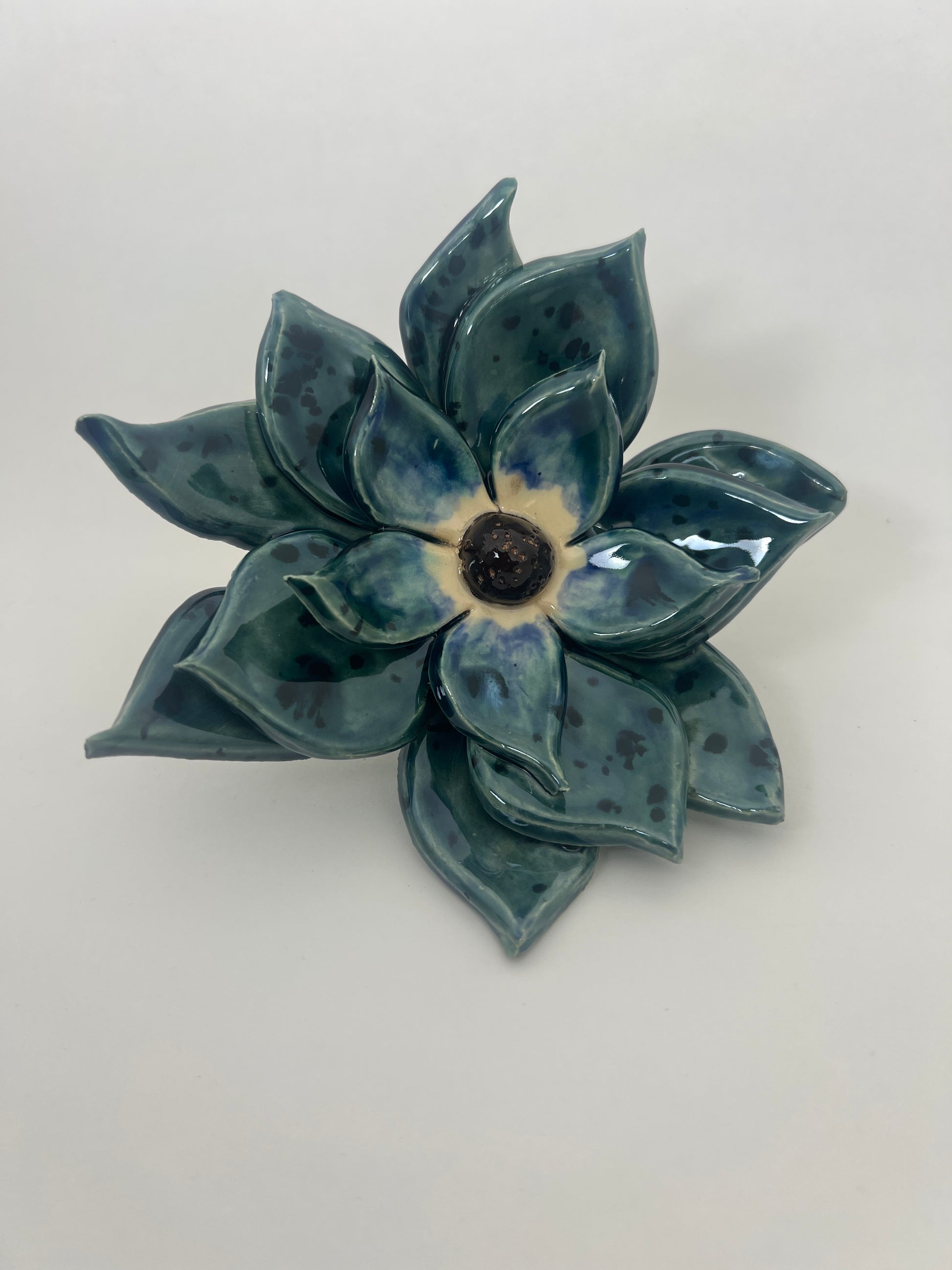 Ceramic flower equipped with a place for a garden stake 3/8” in diameter. Flower measures near 4.25" tall and 6.25” wide.