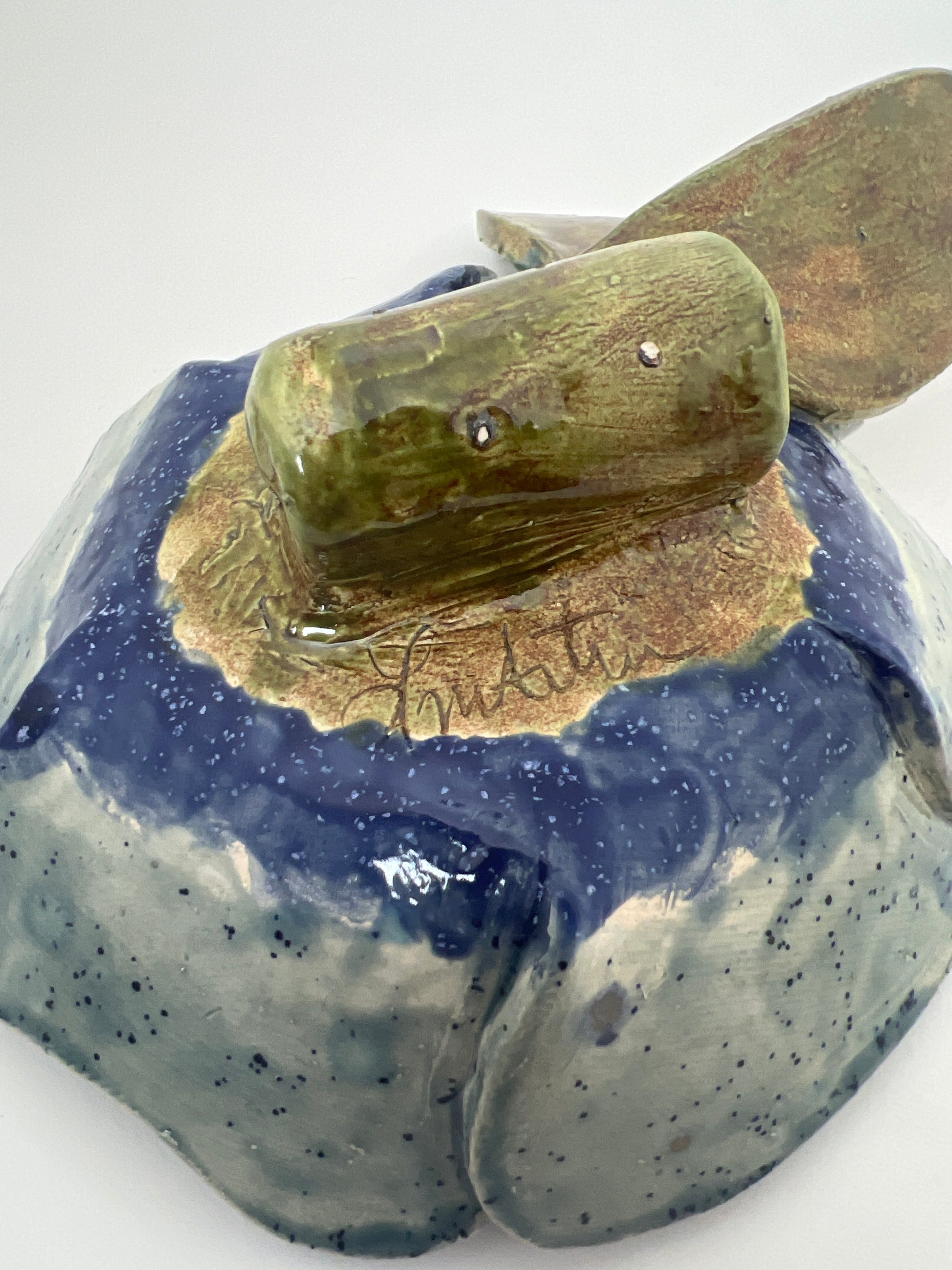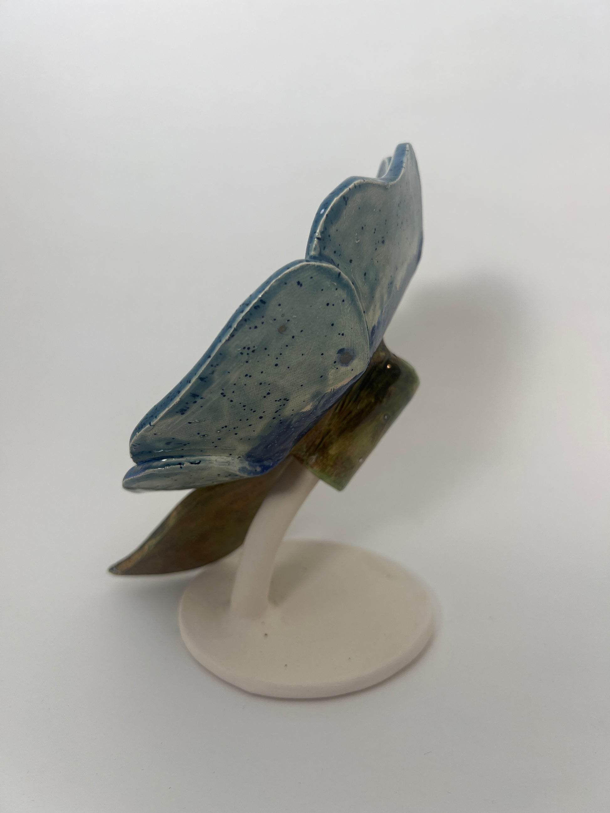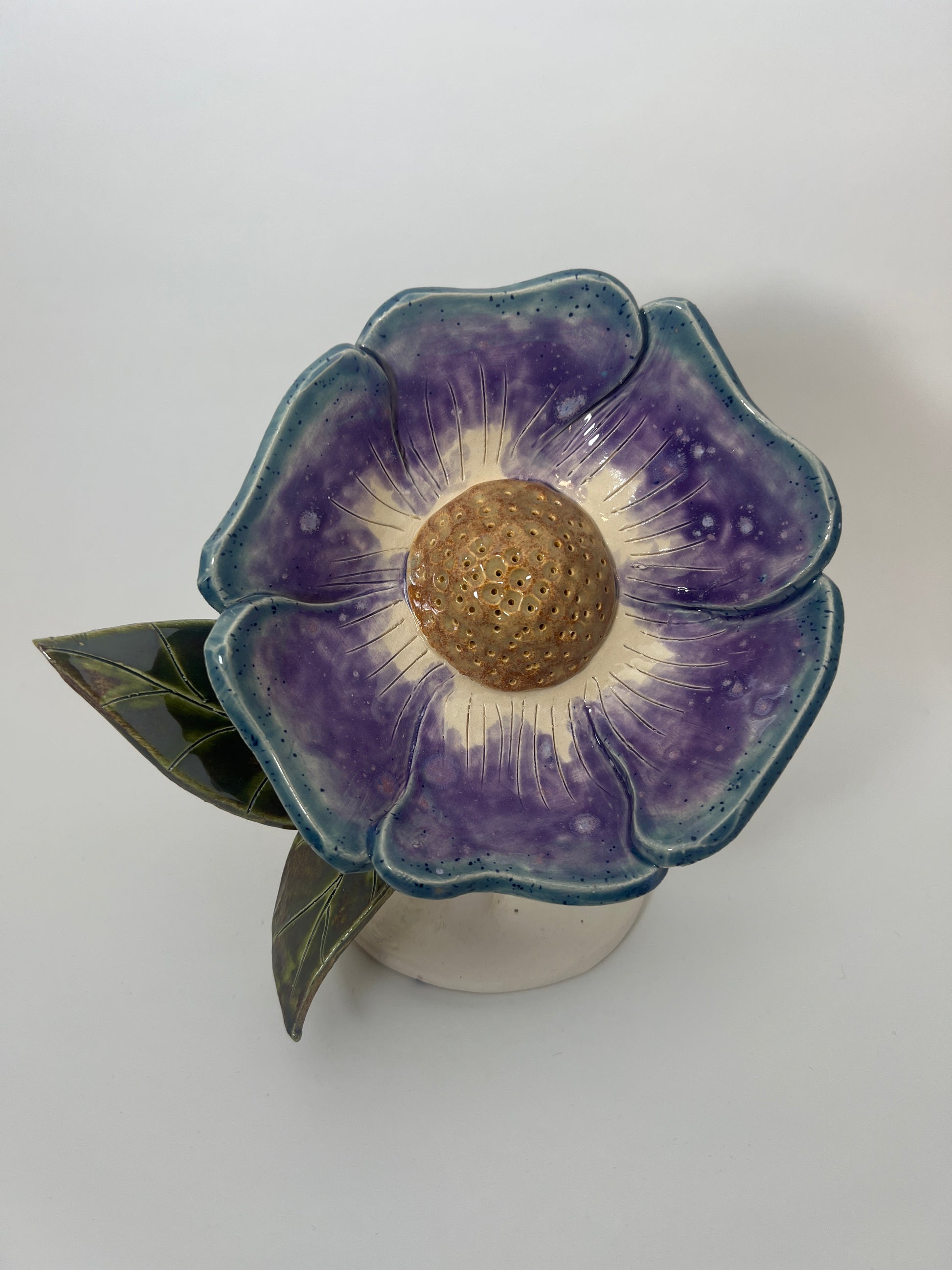 Ceramic flower equipped with a place for a garden stake 3/8” in diameter. Flower measures near 7.25” wide and 2.5”deep.