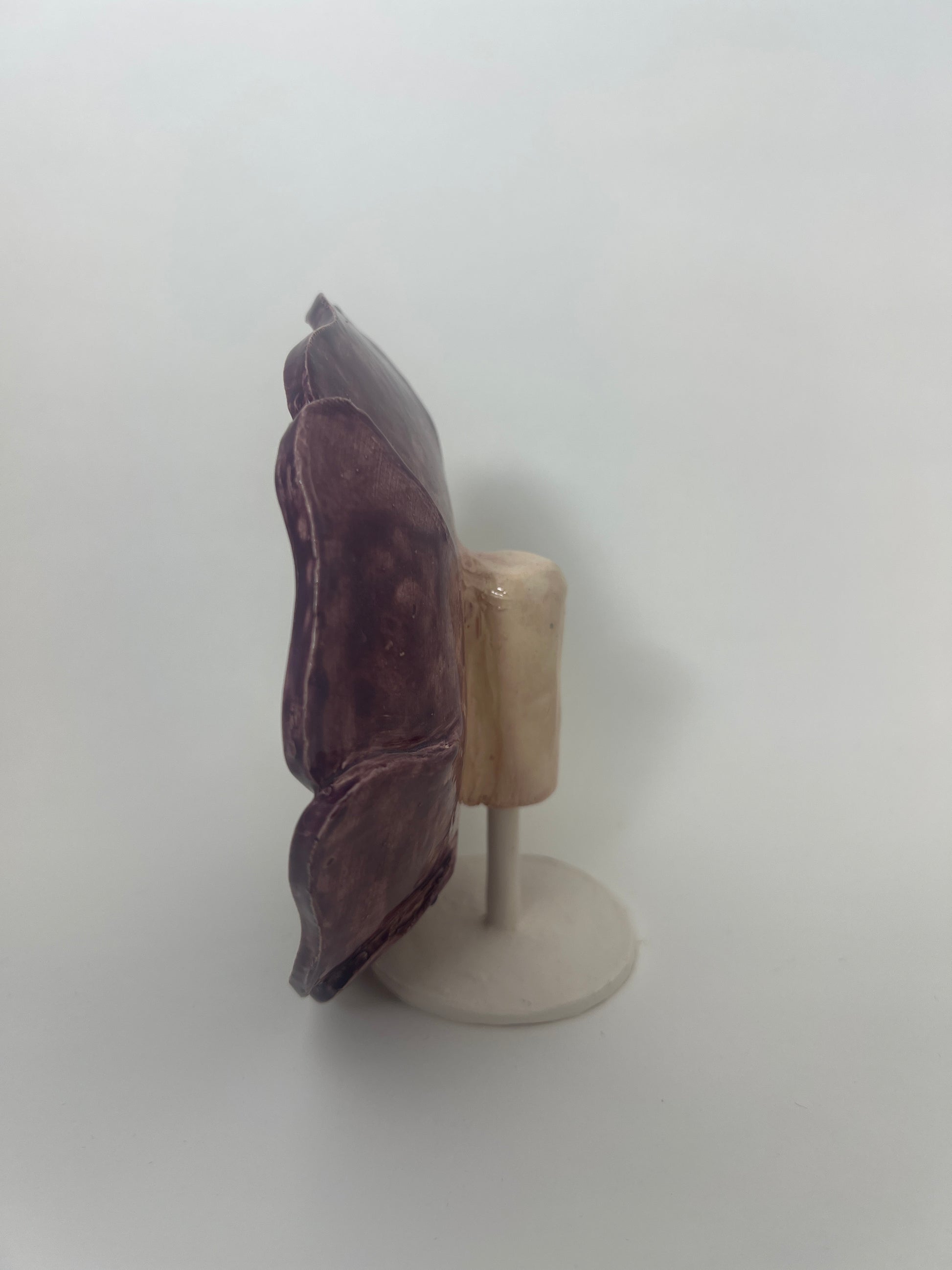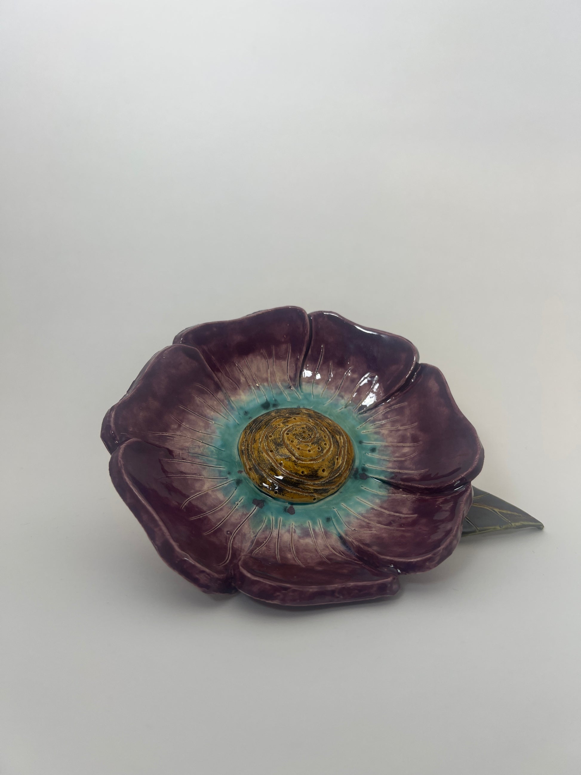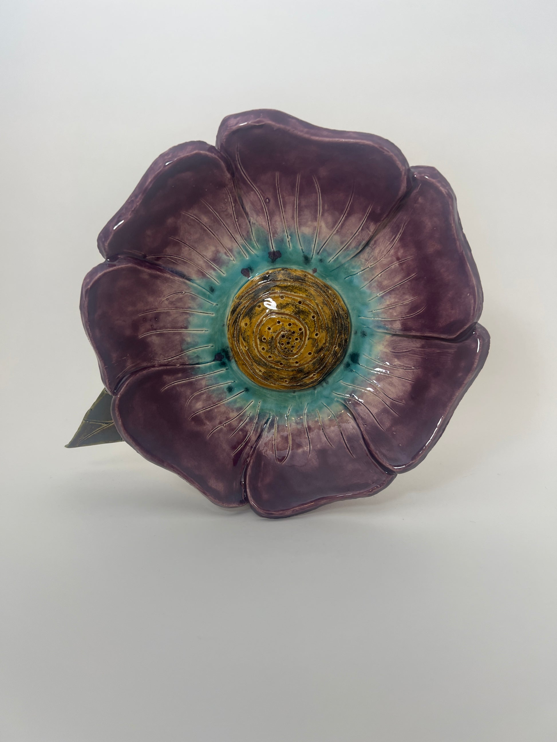 Ceramic flower equipped with a place for a garden stake 3/8” in diameter. Flower measures near 7” wide and 2.5”deep.